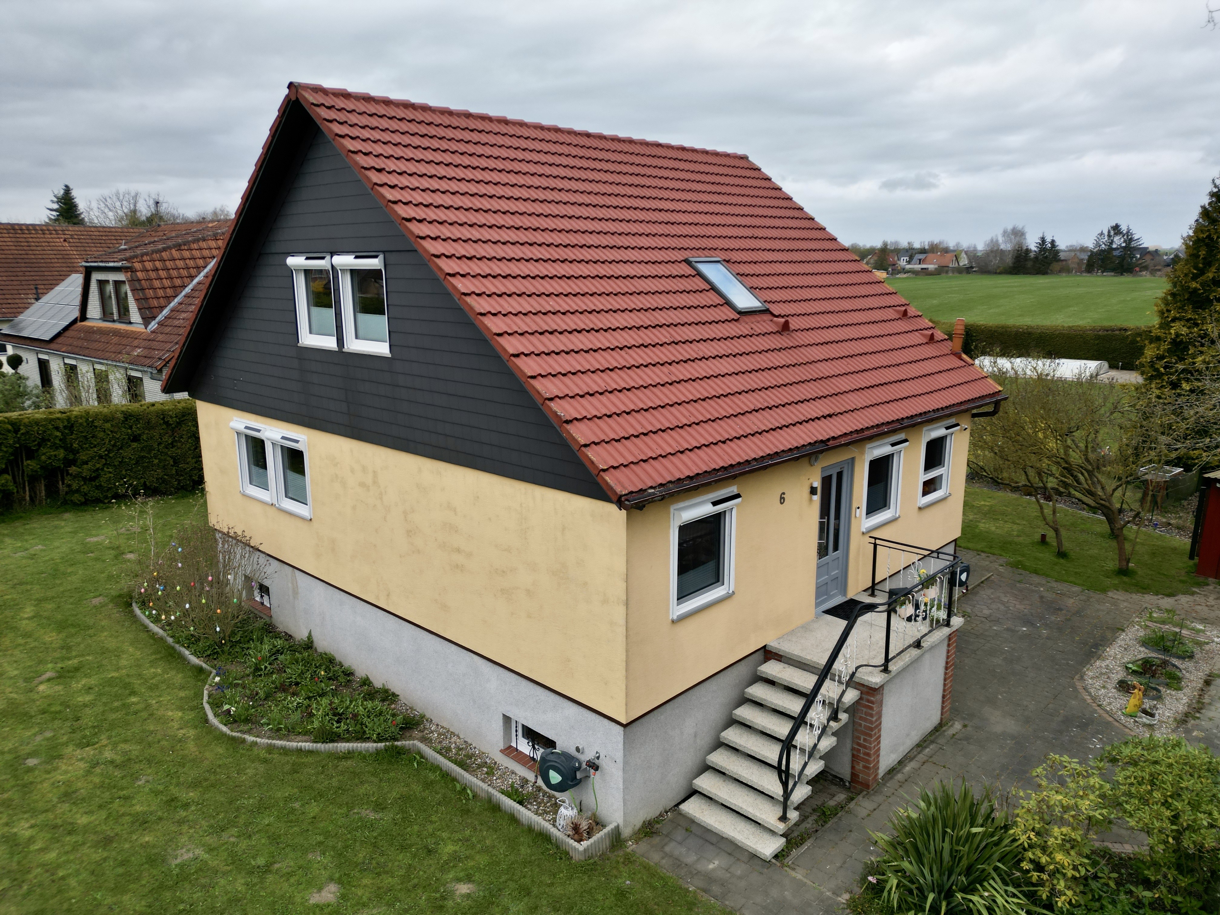Beim Rundgang fiel mir sofort der Stilbruch am Haus auf: Die Giebel waren mit anthrazitfarbenem Schiefer verkleidet, der Sockel war ebenfalls in einem anthrazit-weißen Ton gehalten – nur das Dach leuchtete noch in klassischem Ziegelrot.