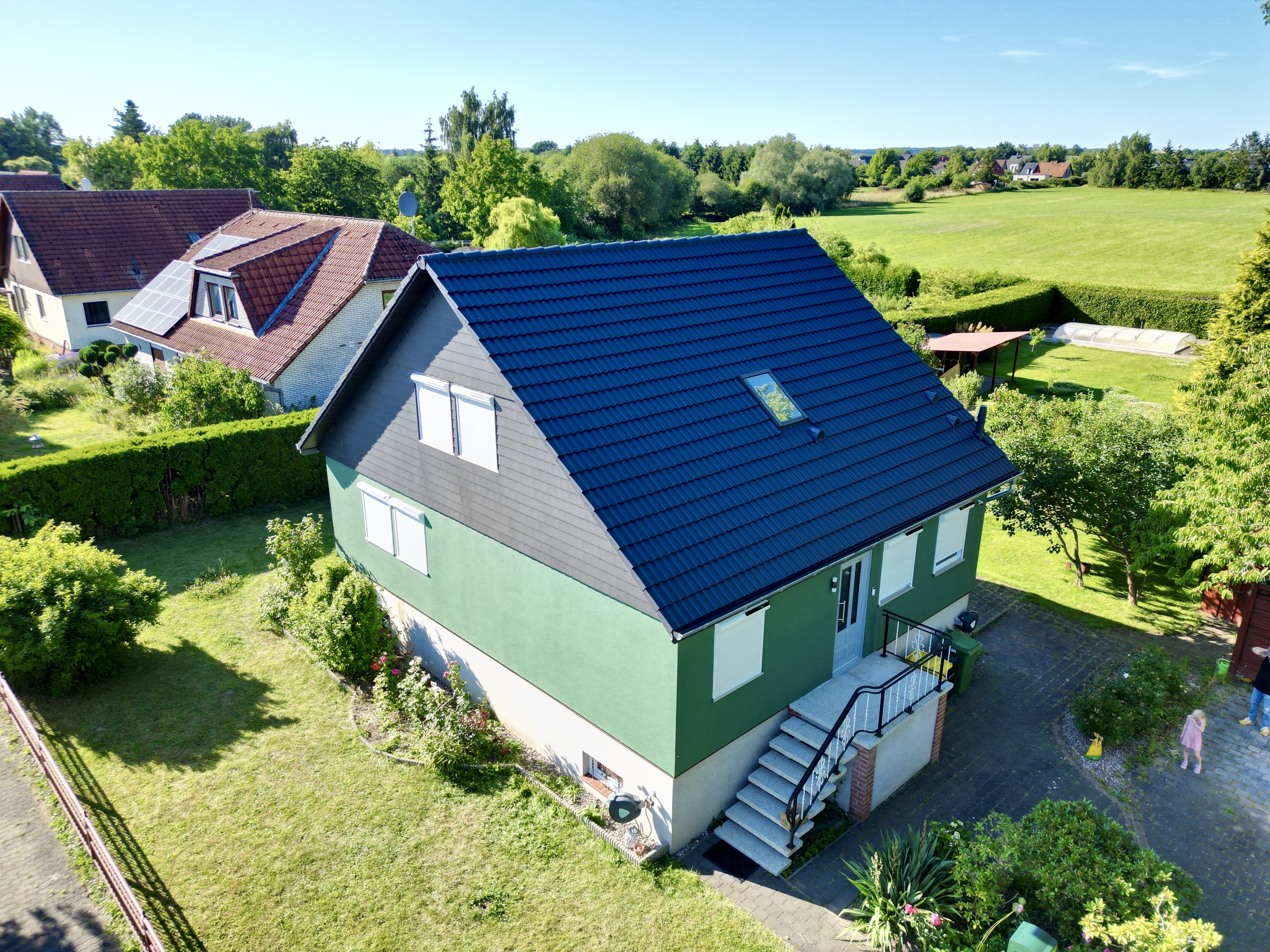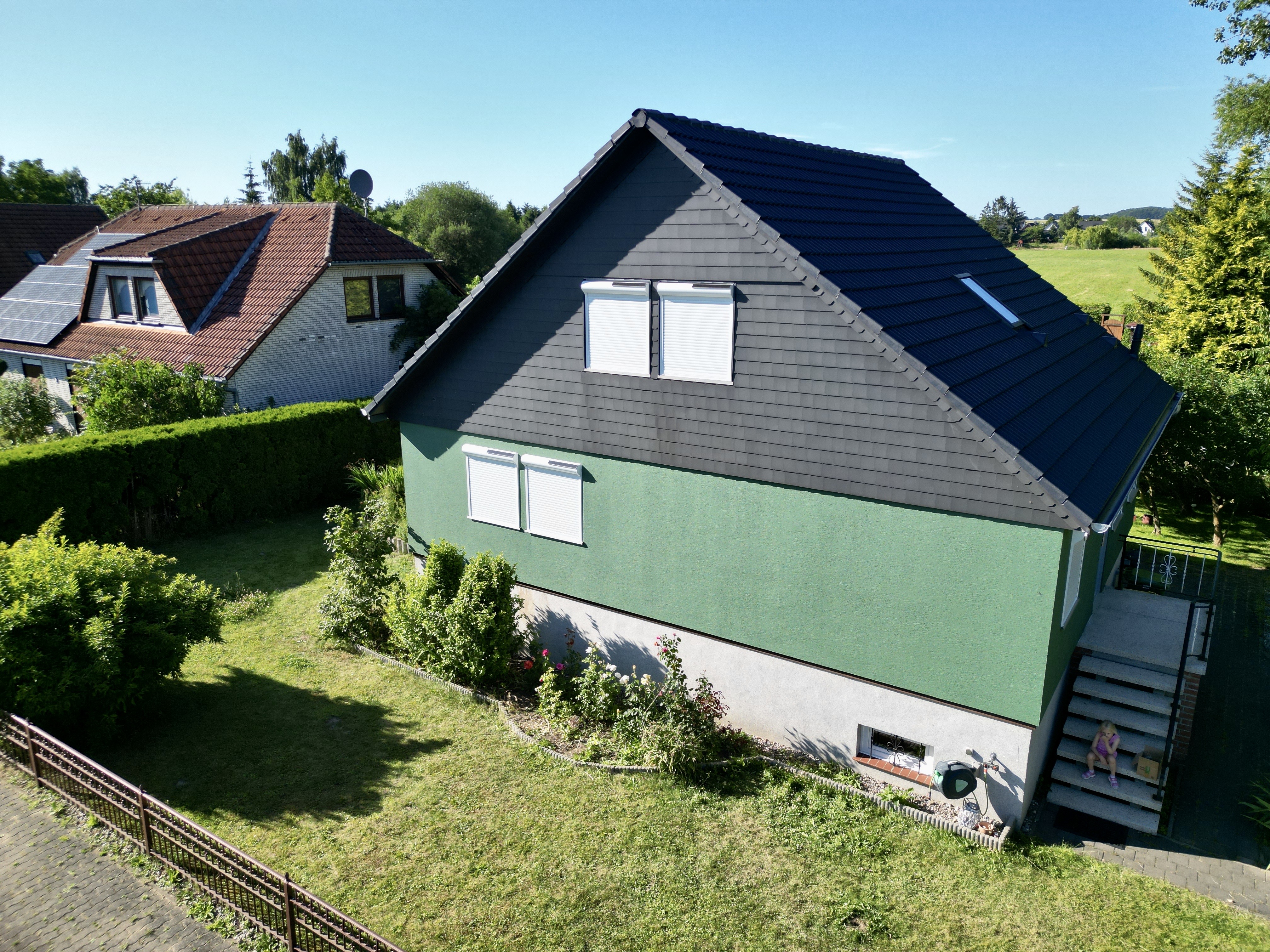 Satte grüne Fassade, anthrazitfarbenes Dach – ein völlig neues Erscheinungsbild mit echtem Wow-Effekt.